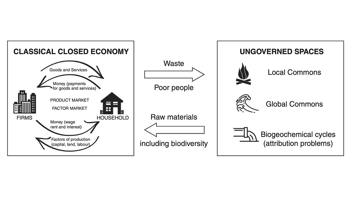 Most standard economics textbooks depict the economy as a closed system of exchange between firms and individuals (left side of Figure 1.1), but ecological economists have pointed out that the economy is not a closed system and therefore cannot simply grow itself out of trouble as is too often assumed (Ropke, 2004; Daly, 2005; Vatn, 2015).