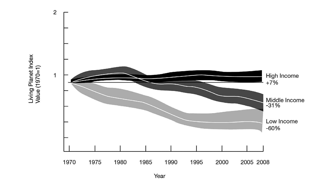 Biodiversity is recovering slightly in countries with rich institutions despite a high per capita environmental footprint, whereas middle- or low-income countries with weaker institutions are losing species rapidly despite low per capita consumption (Figure 1.3).