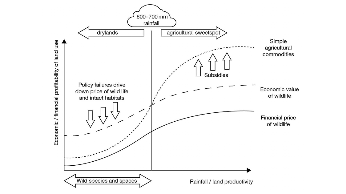- Subsidies for agriculture, combined with the absence of property rights for wild resources, tilt the playing field against wildlife and produce the wrong outcomes at massive scale.